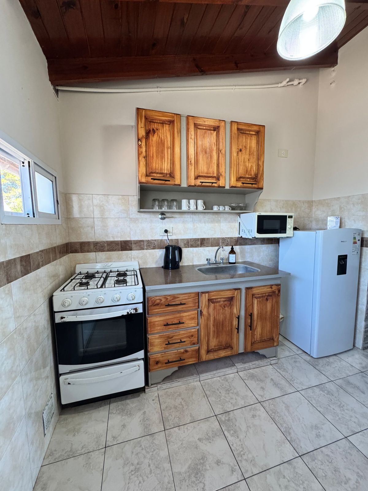 - Cocina con horno, heladera, microondas, vajilla y pava eléctrica